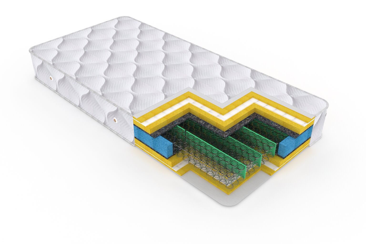 Матрас изготовлен из битронной пружинной сетки типа BONELL с 5 проволочными кольцами из углеродистой стали толщиной 2,2 мм, термообработанными при токах высокой частоты, что обеспечивает длительное сопротивление эластичности провода. Каждый ряд пружин соединен между собой спиральной проволокой толщиной 1,4 мм, которая обеспечивает сопротивление движению матраса. Периметрическое усиление матраса с помощью пенополиуретана высокой плотности SISTEM BOX не позволяет ему деформироваться или проседать со временем. Над пружинной сеткой (эластичный сердечник) с обеих сторон размещен слой текстильной опоры, войлок - 1000 гр/м2., затем слой пенополиуретана плотностью 21 кг/м2, толщиной 3 см, склеенный специальным клеем, экологически чистым, в соответствии с европейскими стандартами. Внешний материал состоит из 3 слоев, полностью дополненных жаккардом, вместе со слоем хлопка 200 гр/м2 и TNT 15 гр/м2. Край матраса также укреплен вокруг него декоративной лентой на каждом краю матраса двойным шитьем на концах. Матрас снабжен вентиляционными кнопками.